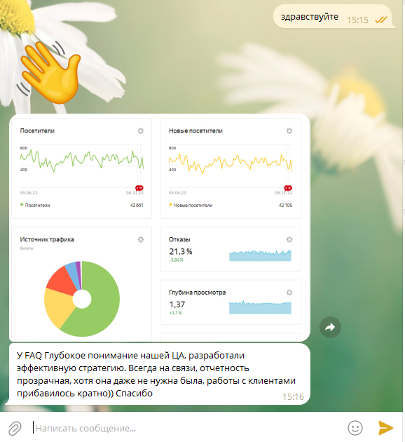 Без перерыва на выходные и праздники ежедневно приводим Клиенту объем трафика с ROMI не ниже 300%